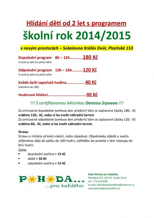 03.08.2014 19:01Právě probíhá rezervace do hlídacího programu pro děti od 2 let! Místo si můžete zajistit telefonicky (776 668 664), nebo mailem: pohodakd@centrum.cz